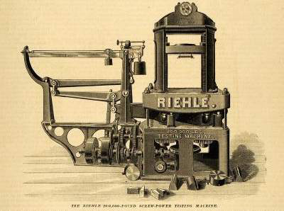 在中國,杠桿式拉伸試驗(yàn)機(jī)被引進(jìn)大概是在上世紀(jì)初,同濟(jì)大學(xué)建設(shè)初期,引進(jìn)一臺同濟(jì)編號為:440001的杠桿式拉伸試驗(yàn)機(jī)(圖二),目前,存放于同濟(jì)大學(xué)力學(xué)試驗(yàn)中心。這臺試驗(yàn)機(jī)上同時(shí)標(biāo)有“RIEHLE BRCXPHILA16494”(圖三)的小字,通過檢索,發(fā)現(xiàn)這臺試驗(yàn)機(jī)是由位于美國費(fèi)城的理勒兄弟測試機(jī)械公司(Riehle Brothers Testing machines Company)生產(chǎn)。